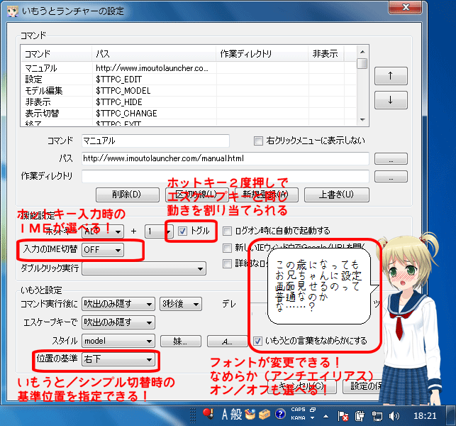 (2)いもうとランチャーを起動し、設定画面「コマンド」タブ左下の「教育」ボタンを押して同梱の「185.imc」を選択するとコマンドが追加されるので設定を保存します。