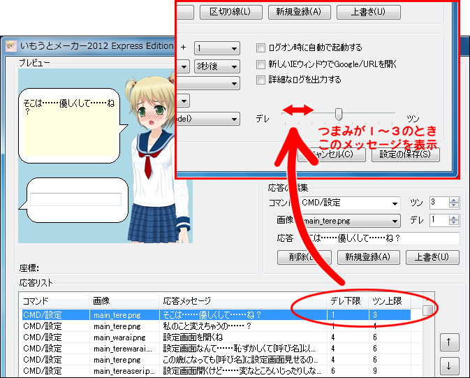 - ツンデレスライダーの搭載 9段階でツン〜デレ度合いを調節可能に! なお1.71までのモデルデータを利用した場合、ツンデレ度に関わらずすべての応答メッセージが表示対象になります(デレ下限1・ツン上限9になります。後述のいもうとメーカーで変更可能)
